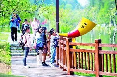 游客在湖南常德桃花源風(fēng)景名勝區(qū)體驗(yàn)“噴泉”游戲。新華社發(fā)