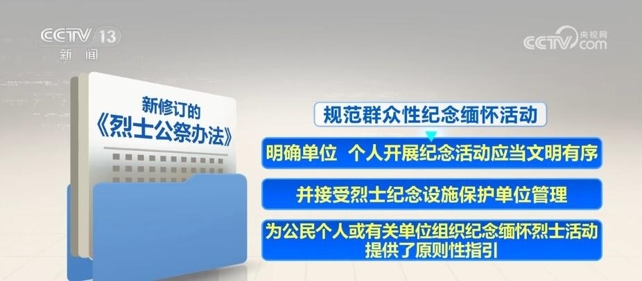 新修訂的《烈士公祭辦法》自5月1日起施行。其中,強調(diào)發(fā)揮公祭活動對青少年的教育作用,要求各級各類學(xué)校組織學(xué)生以適當方式參加烈士公祭,加強愛國主義、集體主義、社會主義教育。規(guī)范群眾性紀念緬懷活動,明確單位、個人開展紀念活動應(yīng)當文明有序,并接受烈士紀念設(shè)施保護單位管理,為公民個人或有關(guān)單位組織紀念緬懷烈士活動提供了原則性指引。