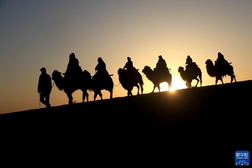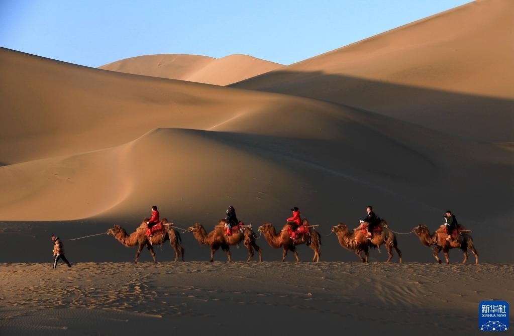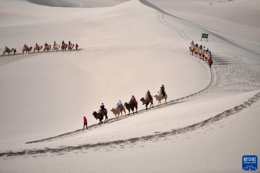 金色的鳴沙山上響起陣陣駝鈴聲,編號(hào)“414”的領(lǐng)頭駱駝和51歲的牽駝人曹文華一起帶領(lǐng)著駝隊(duì),馱著游客,朝連綿起伏的沙丘深處走去。