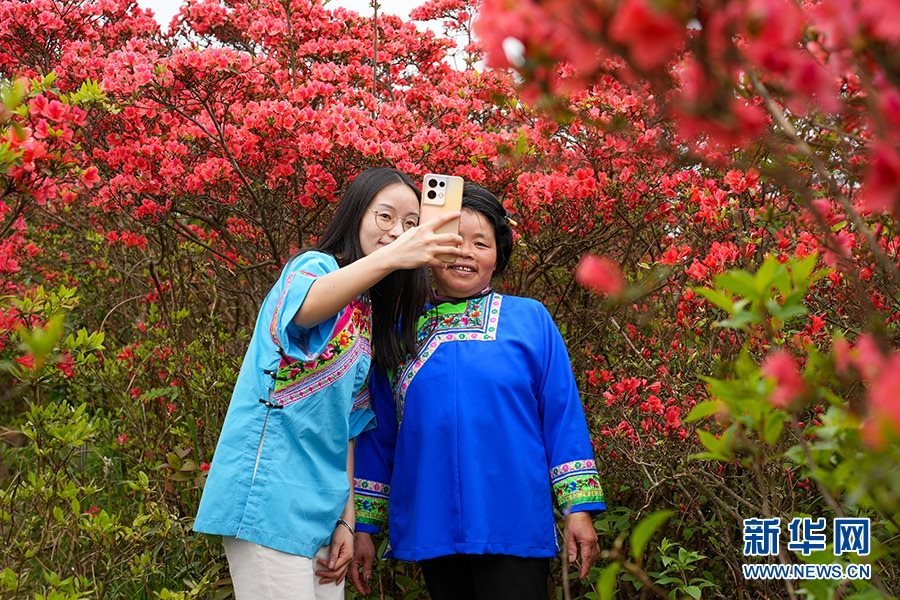 當(dāng)日,在貴州省黔東南苗族侗族自治州丹寨縣縣城邊海拔1400多米的龍泉山,萬(wàn)畝杜鵑花競(jìng)相綻放,山谷間、棧道旁、懸崖上,一顆顆、一簇簇、一朵朵杜鵑花迎風(fēng)搖曳,形成浩瀚花海,引來眾多游客登高望遠(yuǎn),飽覽靈山秀水之美。