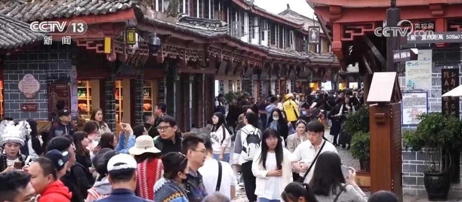 總臺記者 郭琳潔:“五一”假期第三天,臨近中午,麗江古城已經(jīng)是人流如織。游客有的是一家老小有說有笑,有的是三五好友打卡拍照。陽光明媚的上午,漫步在古香古色的四方街,探訪小橋流水人家,非常愜意悠閑。商家們?yōu)榱擞佑慰鸵沧鲎懔藴蕚?,各種特色工藝品、熱氣騰騰的美食隨處可見,還有民族特色的歌舞表演,讓大家感受納西族傳統(tǒng)文化的魅力。