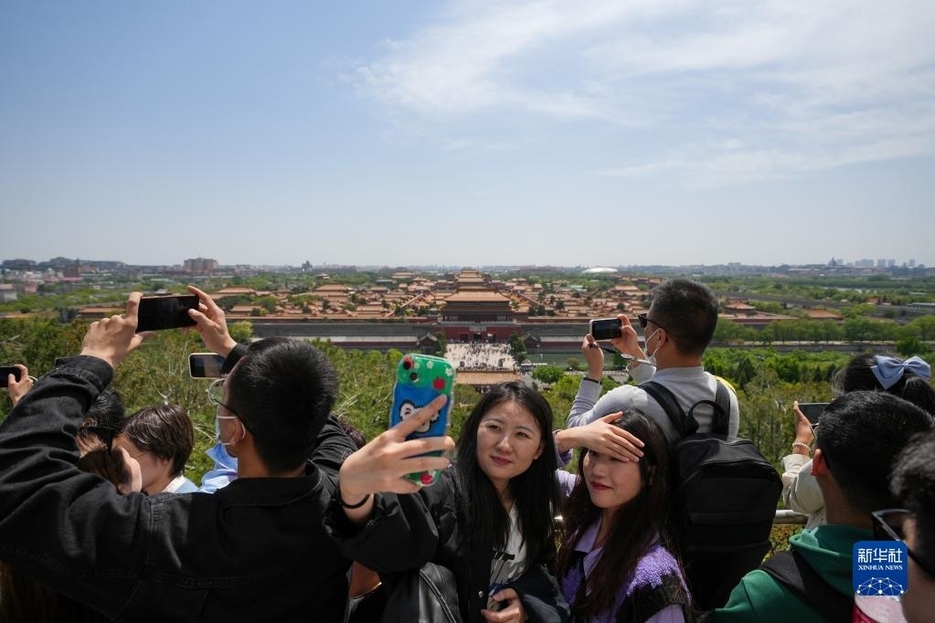4月29日,游客在北京景山公園登高賞景拍照。   新華社記者 鞠煥宗 攝