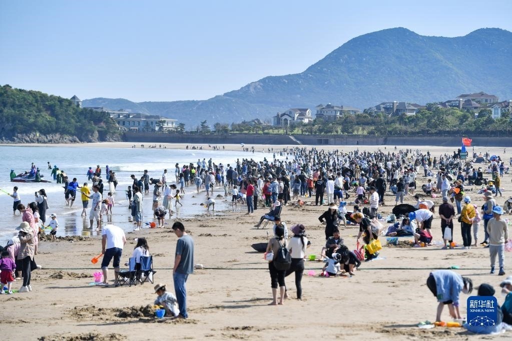 4月30日,游客在浙江舟山朱家尖景區(qū)沙灘上嬉戲游玩。   新華社發(fā)(沈磊 攝)