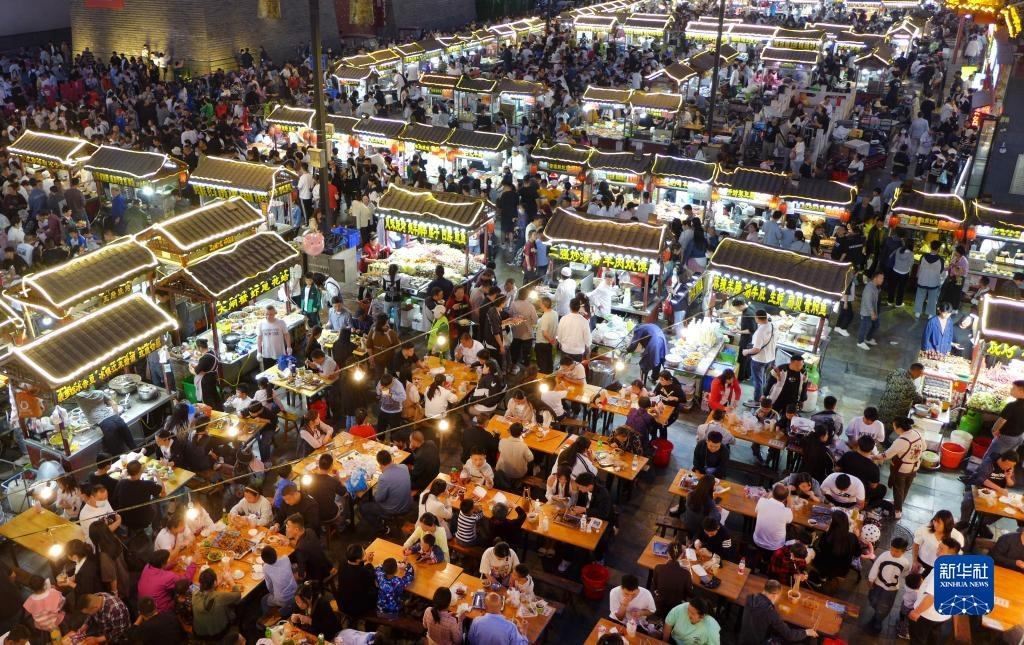 4月30日,游客在河南省開封市鼓樓夜市品嘗小吃。   新華社發(fā)(李俊生 攝)