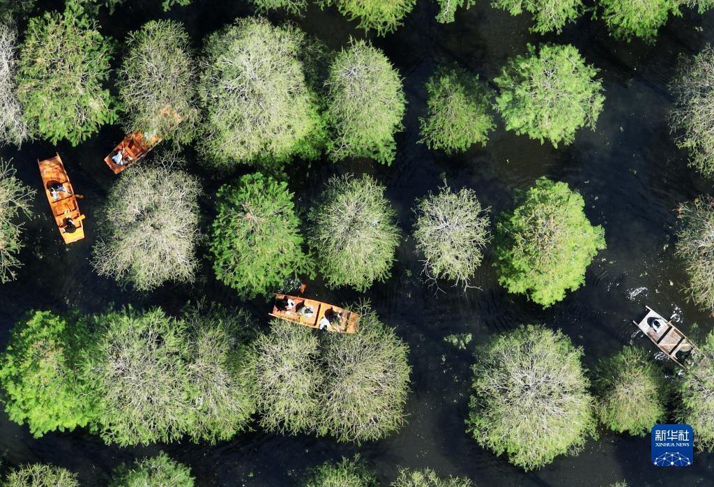 5月1日,游客在江蘇省揚州市淥洋湖濕地公園的水上森林乘船游覽(無人機照片)。   新華社發(fā)(孟德龍 攝)