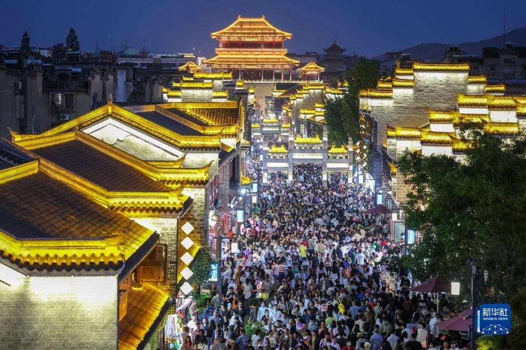 4月30日,游客在湖北襄陽古城北街游玩。   新華社發(fā)(楊東攝)