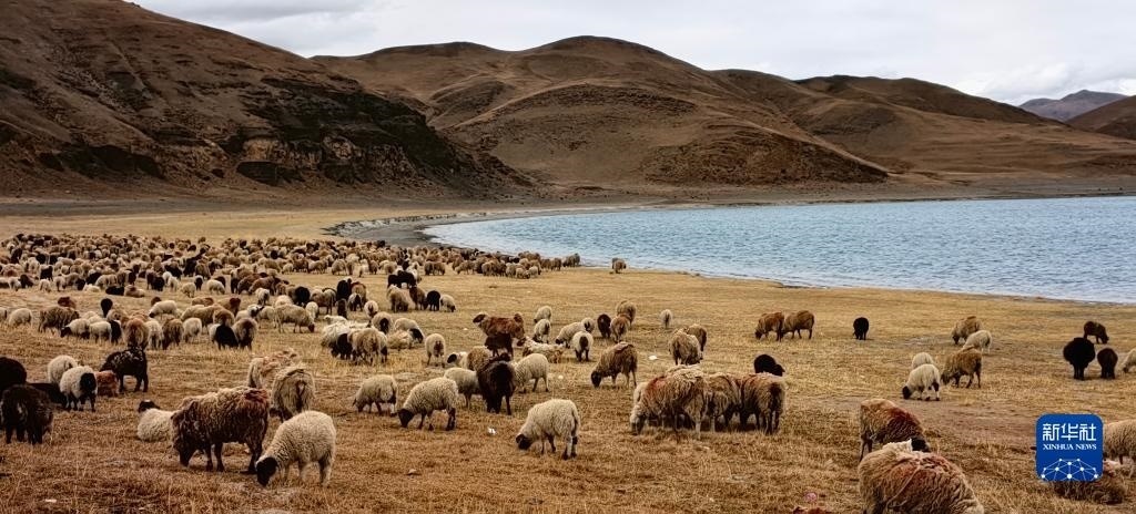 羊卓雍錯湖邊的羊群(5月1日攝,手機(jī)照片)。   新華社記者 沈虹冰 攝