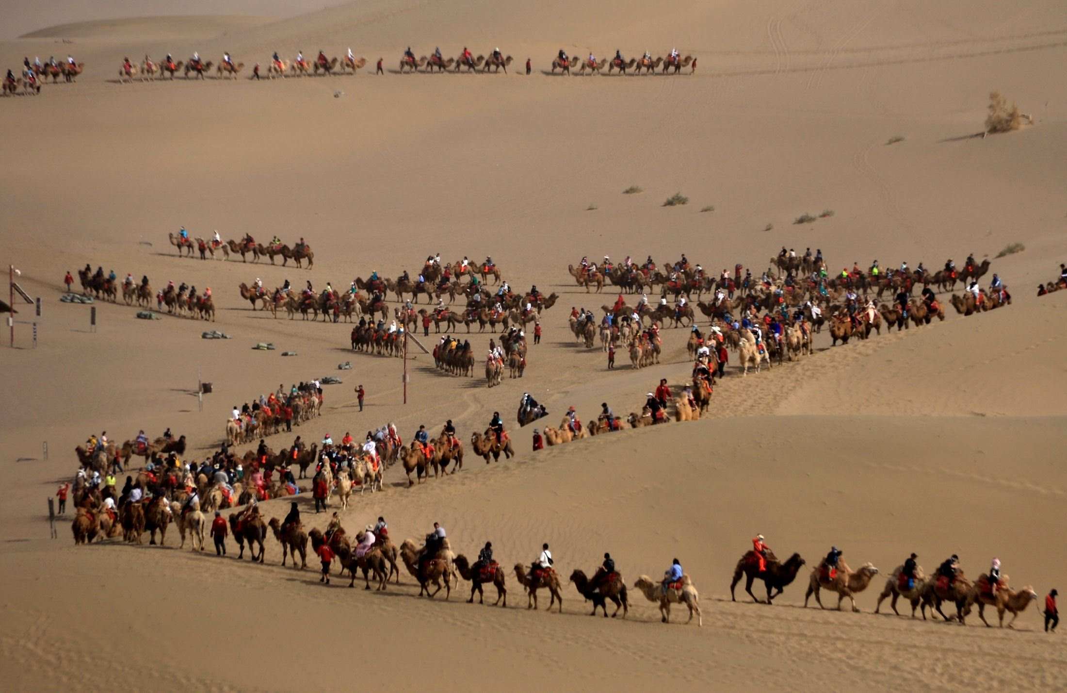 2023年5月1日,甘肅酒泉,敦煌市鳴沙山月牙泉景區(qū),“駱駝紅綠燈”亮起,農(nóng)戶牽著駱駝有序通過。