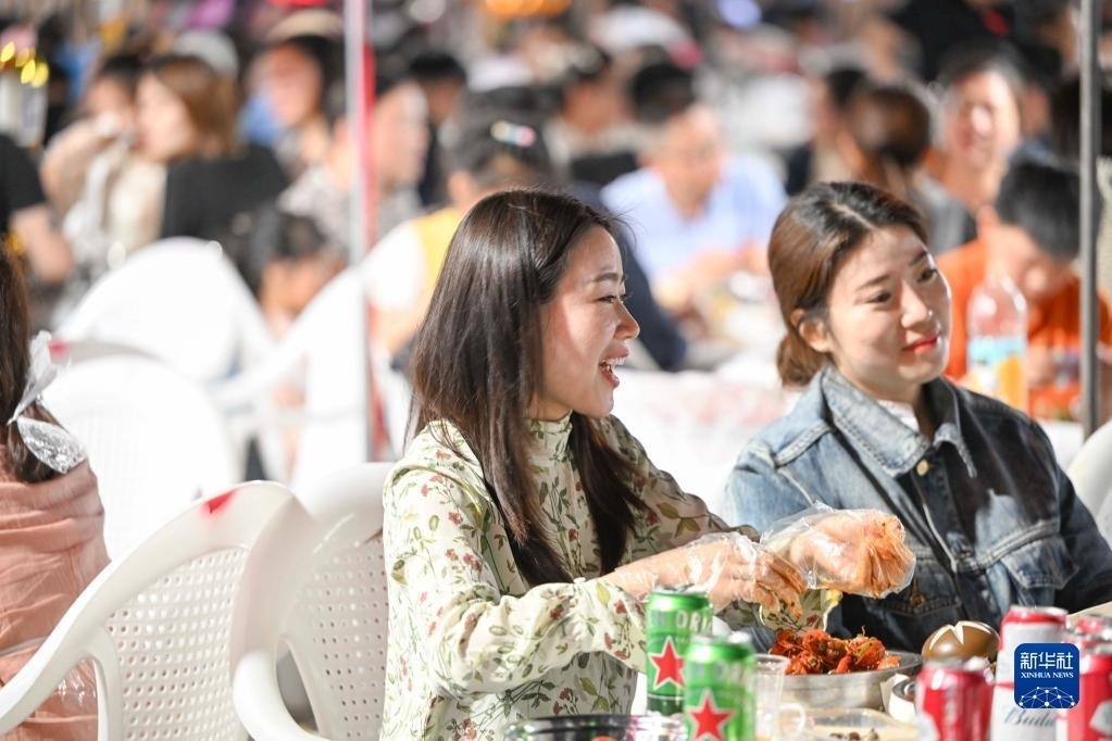 5月2日,游客在江蘇省淮安市金湖縣龍蝦廣場(chǎng)品嘗金湖小龍蝦。