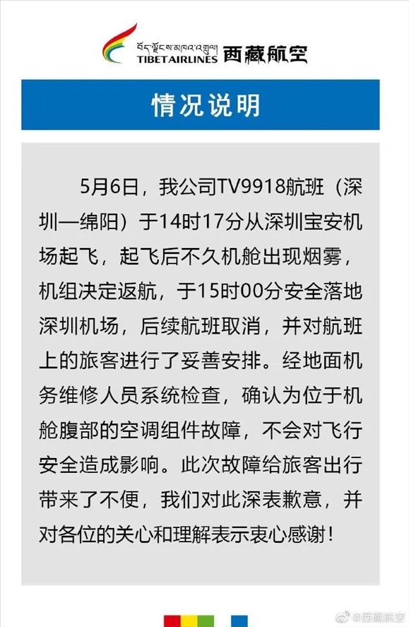·西藏航空回應飛機內(nèi)出現(xiàn)濃煙返航:空調(diào)組件故障。