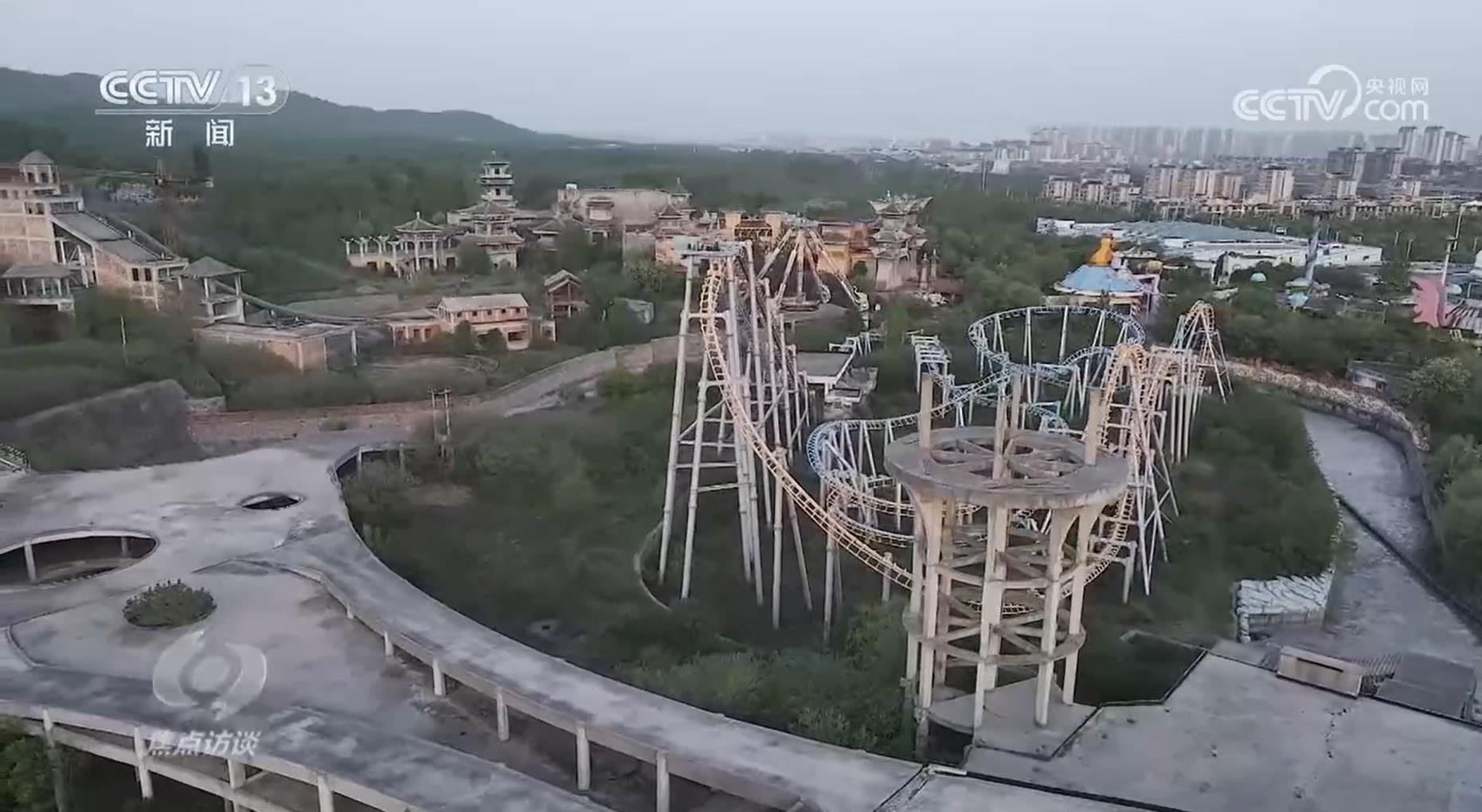 我們沒有找到動(dòng)漫研發(fā)基地,只找到一個(gè)辦公樓,但它沒有一天用于動(dòng)漫研發(fā),而是個(gè)售樓處。動(dòng)漫基地是這樣,那么主題樂園呢?泰安志高集團(tuán)在合同中承諾要“建成國(guó)內(nèi)一流水準(zhǔn)的淮南文化科技動(dòng)漫產(chǎn)業(yè)園和大型商業(yè)中心”。然而,我們看到的卻是另外一番景象:大部分建筑基本上都已封頂,娛樂設(shè)施也已就位,但是如今卻破敗不堪。