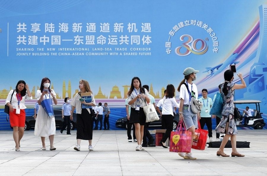 2021年9月11日,在廣西南寧國(guó)際會(huì)展中心,參觀者走出第18屆中國(guó)—東盟博覽會(huì)展館。新華社記者 陸波岸 攝