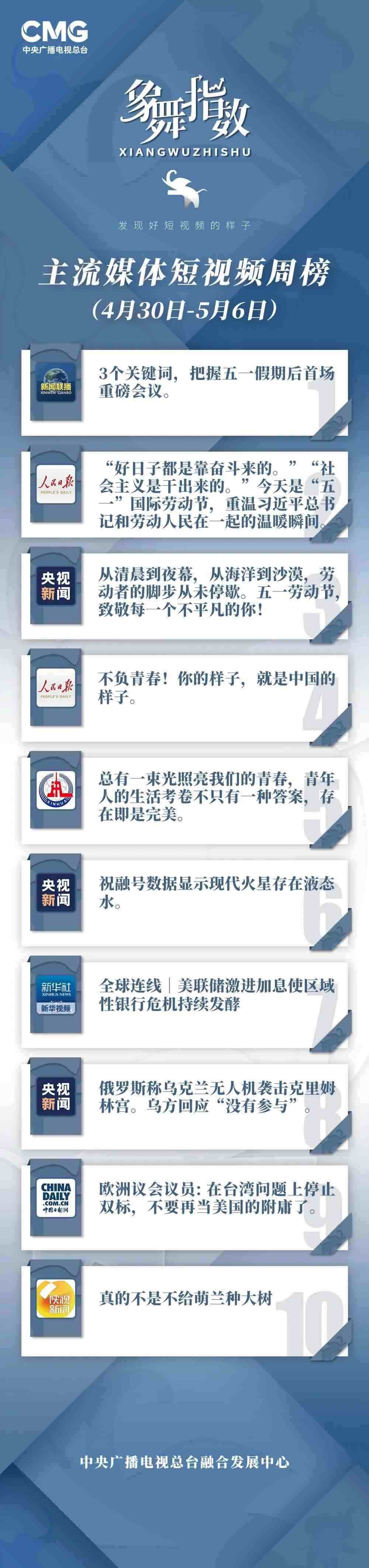 中央廣播電視總臺(tái)“象舞指數(shù)”評(píng)議品牌,推出主流媒體短視頻周榜、總臺(tái)短視頻周榜。在2023年4月30日—5月6日,這些內(nèi)容引發(fā)大眾關(guān)注:
