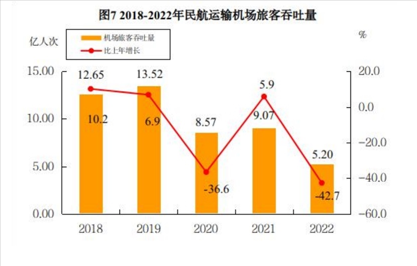 2018年至2022年民航運(yùn)輸機(jī)場旅客吞吐量。來源于2022年民航行業(yè)發(fā)展統(tǒng)計(jì)公報(bào)