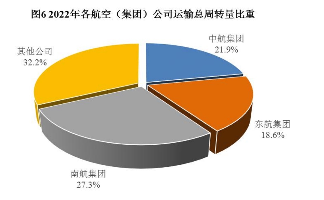 2022年各航空(集團(tuán))公司運(yùn)輸總周轉(zhuǎn)量比重。來源于2022年民航行業(yè)發(fā)展統(tǒng)計(jì)公報(bào)