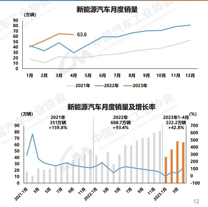 中汽協(xié)數(shù)據(jù)顯示,1-4月,新能源汽車產(chǎn)銷分別完成229.1萬輛和222.2萬輛,同比均增長42.8%,市場占有率達(dá)到27%。4月,新能源汽車產(chǎn)銷分別完成64萬輛和63.6萬輛,同比均增長1.1倍,市場占有率達(dá)到29.5%。