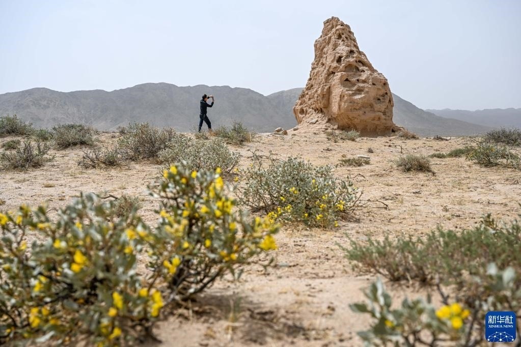 5月13日,駝峰(長城)文物保護(hù)隊(duì)員布音烏力吉在阿拉善左旗一處烽火臺遺址巡查并拍照記錄。