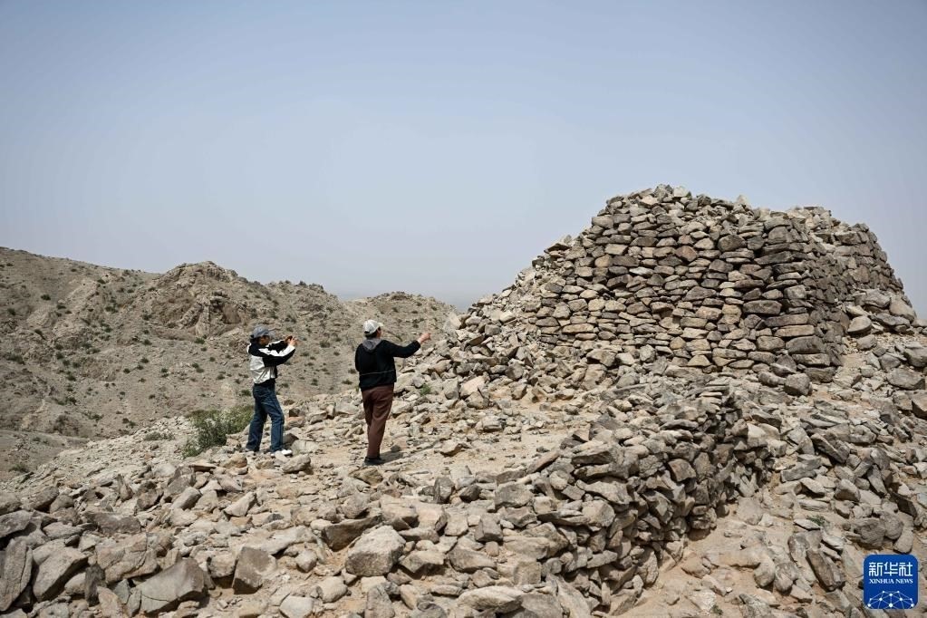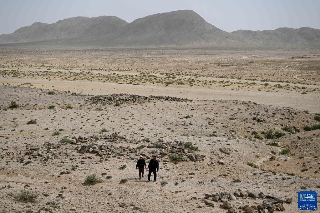 5月13日,駝峰(長城)文物保護(hù)隊(duì)員許繼龍(右)和烏仁其其格在巡查阿拉善左旗一處石圈遺址。
