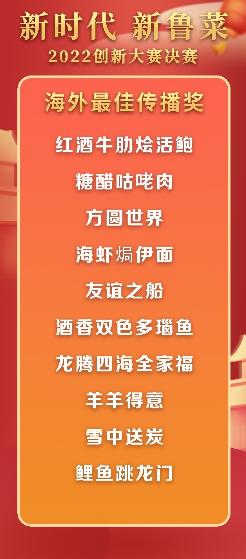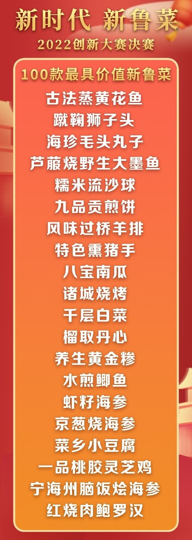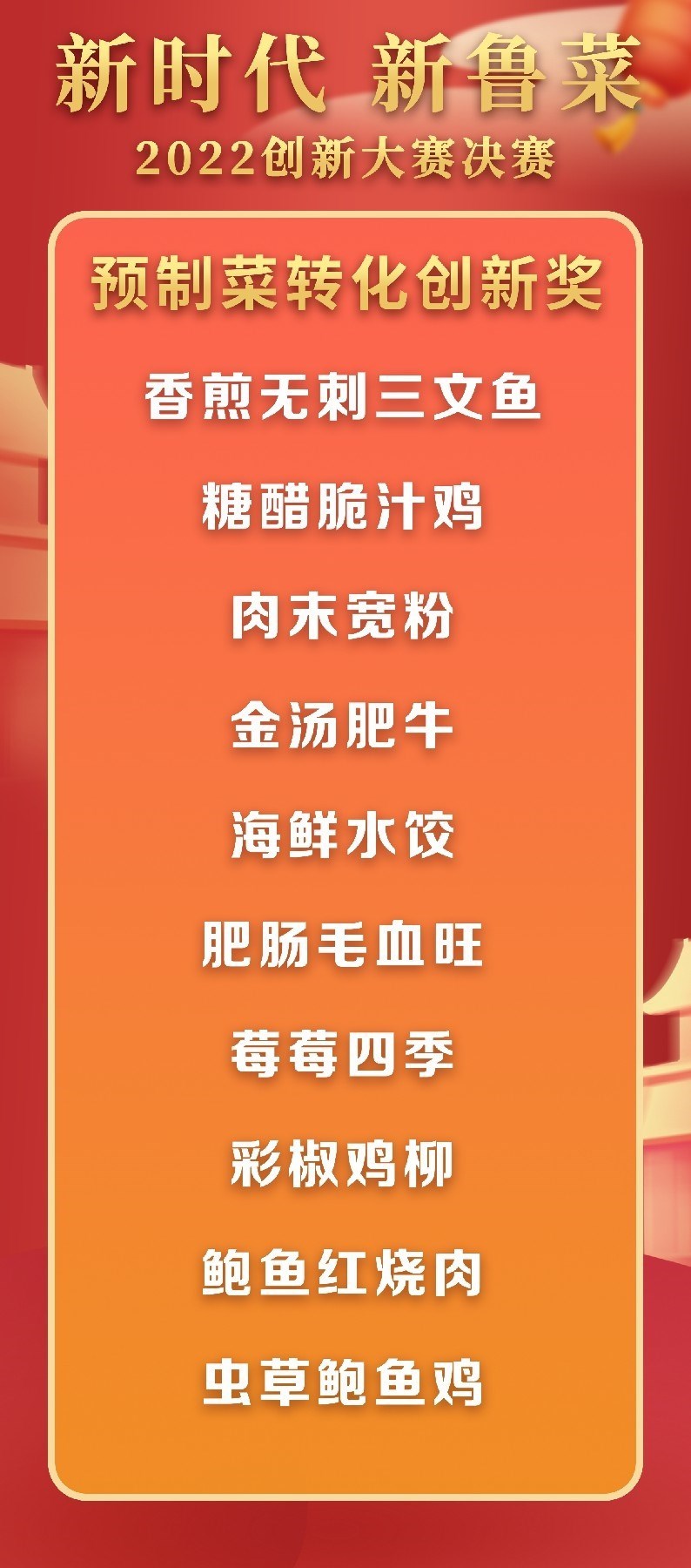 5月18日至19日,“新時代 新魯菜”2022創(chuàng)新大賽決賽暨頒獎活動在山東省濰坊市峽山區(qū)成功舉行,標(biāo)志著本屆大賽圓滿結(jié)束。經(jīng)過激烈角逐,大賽最終頒發(fā)出2022年度“十大魯菜創(chuàng)新菜品”、“20款我最喜愛的新魯菜”、“100款最具價值新魯菜”、“十大創(chuàng)新面點(diǎn)”、“預(yù)制菜轉(zhuǎn)化創(chuàng)新獎”和“海外最佳傳播獎”等獎項(xiàng)。此外,大賽組委會還頒發(fā)了“最佳組織獎”、“融媒貢獻(xiàn)獎”和“特殊貢獻(xiàn)獎”等獎項(xiàng)。