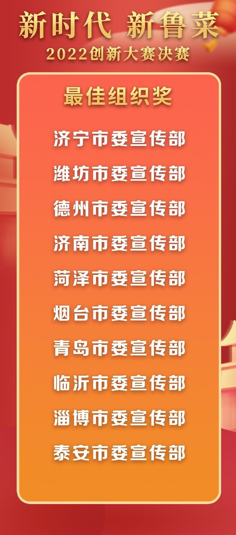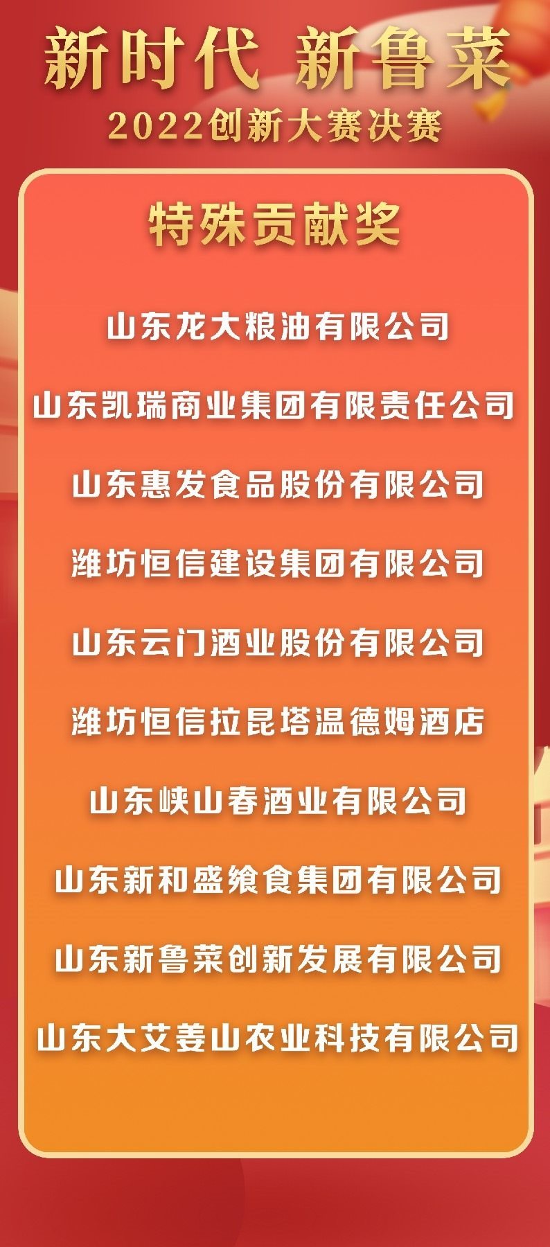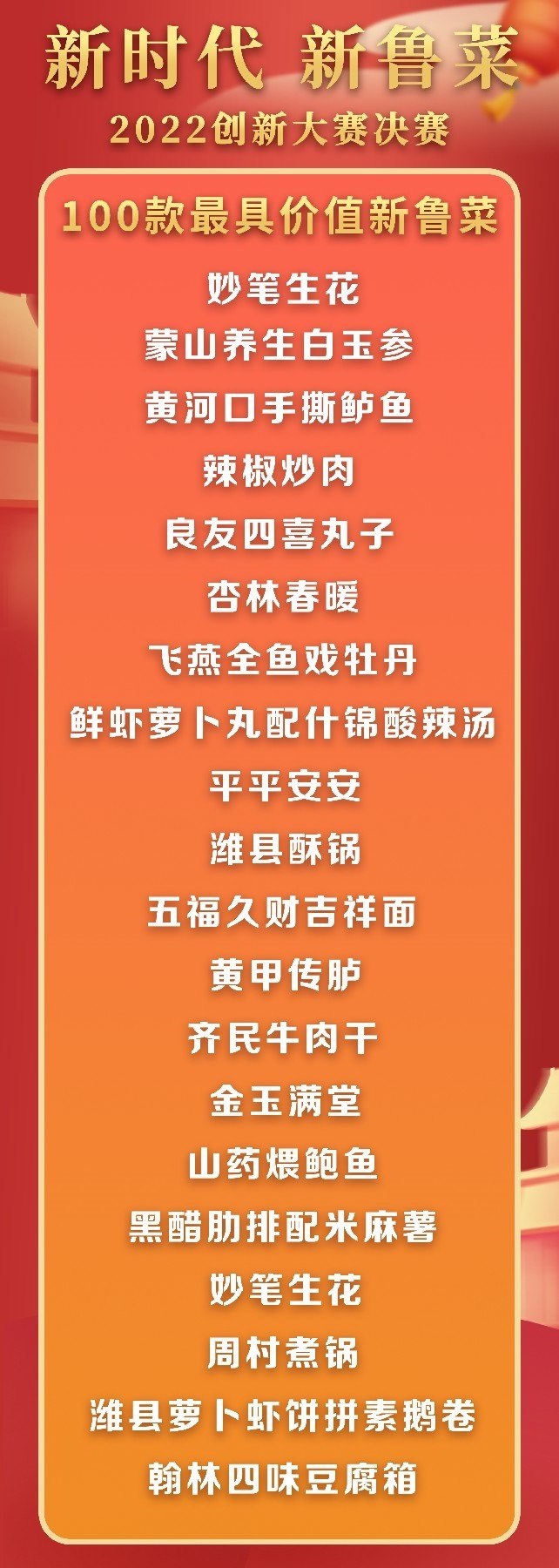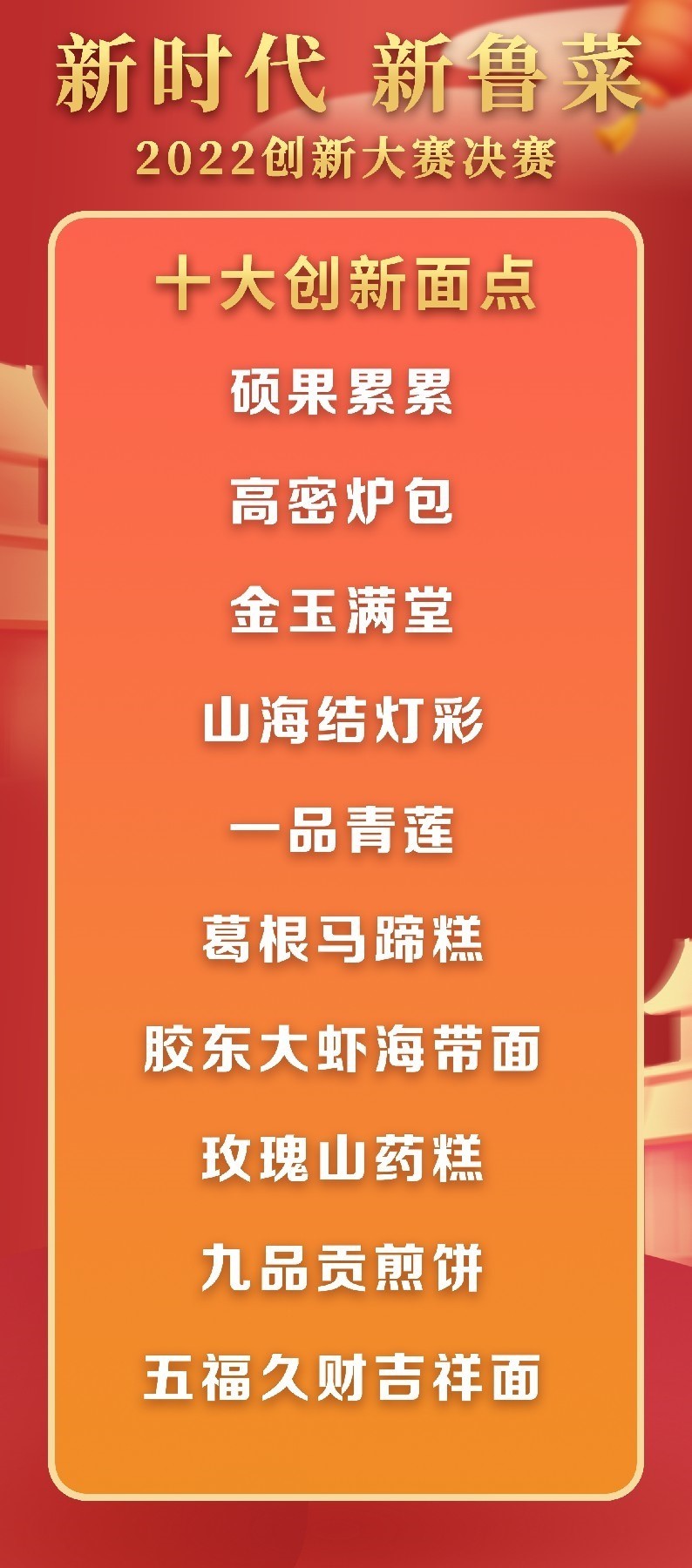 5月18日至19日,“新時代 新魯菜”2022創(chuàng)新大賽決賽暨頒獎活動在山東省濰坊市峽山區(qū)成功舉行,標(biāo)志著本屆大賽圓滿結(jié)束。經(jīng)過激烈角逐,大賽最終頒發(fā)出2022年度“十大魯菜創(chuàng)新菜品”、“20款我最喜愛的新魯菜”、“100款最具價值新魯菜”、“十大創(chuàng)新面點(diǎn)”、“預(yù)制菜轉(zhuǎn)化創(chuàng)新獎”和“海外最佳傳播獎”等獎項(xiàng)。此外,大賽組委會還頒發(fā)了“最佳組織獎”、“融媒貢獻(xiàn)獎”和“特殊貢獻(xiàn)獎”等獎項(xiàng)。