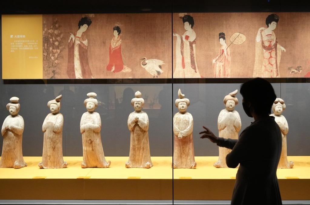 2022年4月13日,觀(guān)眾在西安博物院參觀(guān)唐代女立俑。 新華社記者 李一博 攝