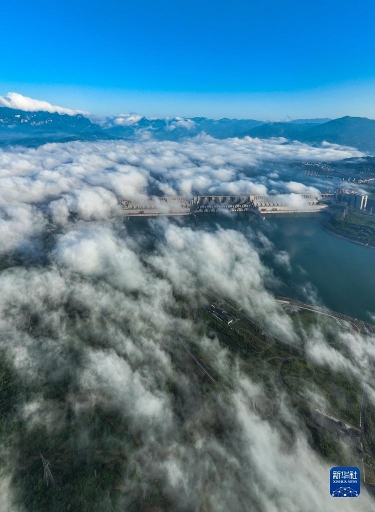 當(dāng)日,湖北宜昌雨過(guò)天晴,三峽上空云霧繚繞,美景如畫。