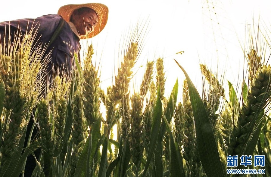 ??夕陽下,麥農察看小麥長勢。新華網 發(fā)(高新生 攝)??