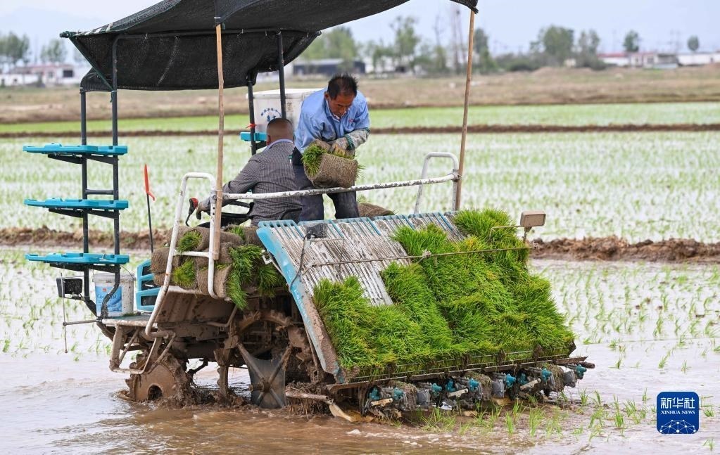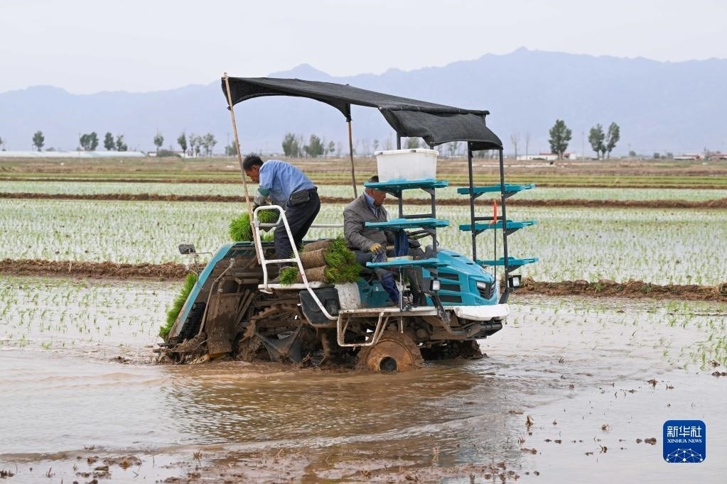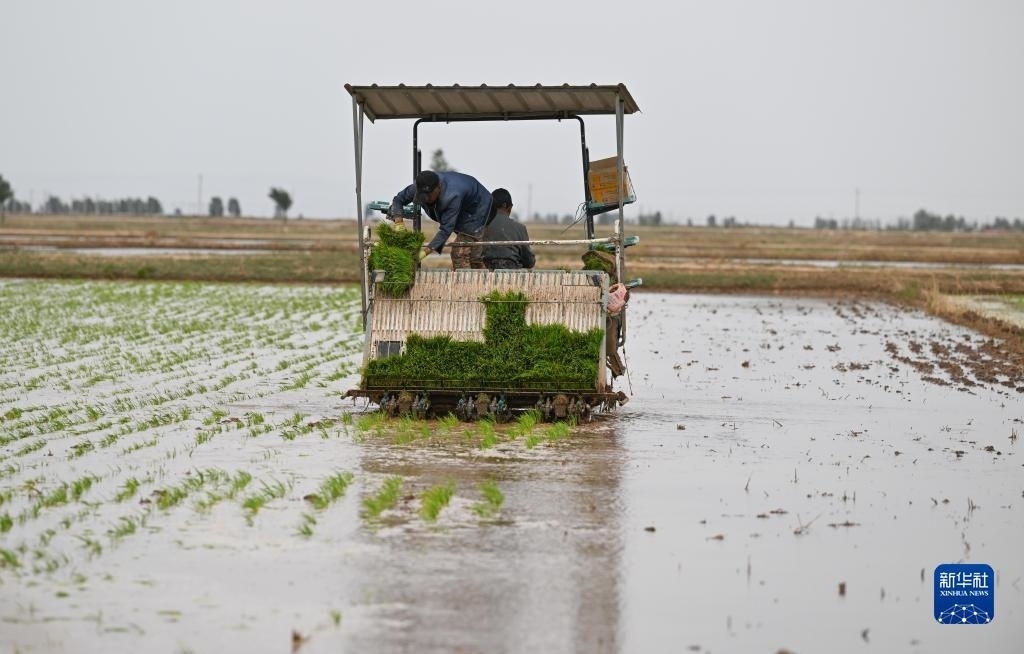 5月23日,達拉特旗昭君鎮(zhèn)村民在鹽堿地改良水稻田中使用農(nóng)機插秧。   新華社記者劉磊攝