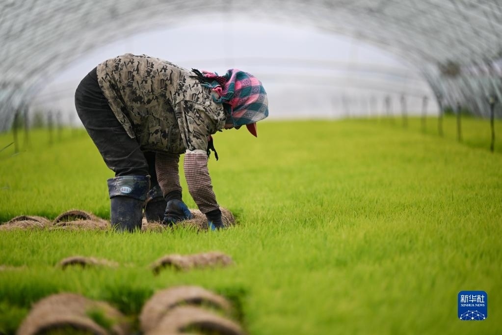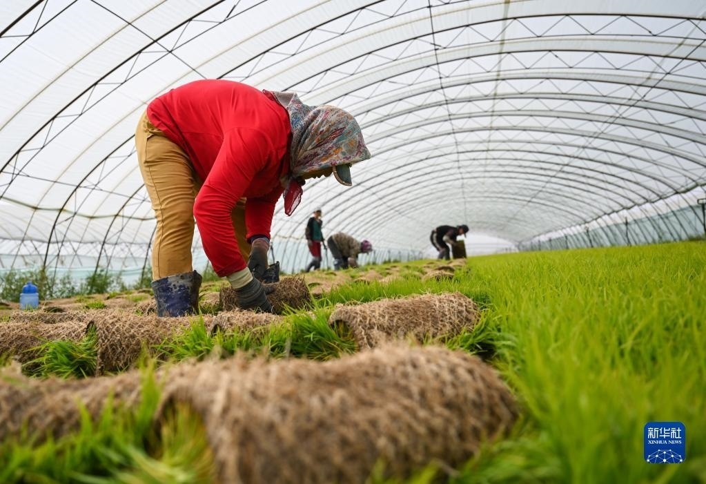 5月23日,達拉特旗昭君鎮(zhèn)村民在育秧苗大棚中起秧。   新華社記者劉磊攝