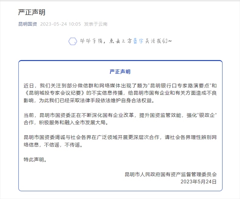 ·昆明市國資委發(fā)布聲明,“昆明銀行口專家路演要點(diǎn)”和《昆明城投專家會(huì)議紀(jì)要》不實(shí)。