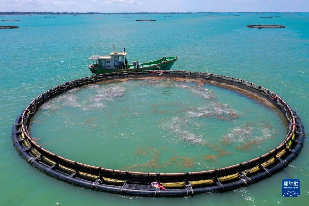 5月27日,在湛江市徐聞縣西連鎮(zhèn),漁業(yè)工人從徐聞國橋深海養(yǎng)殖有限公司的金鯧魚深海網(wǎng)箱捕魚(無人機照片)。