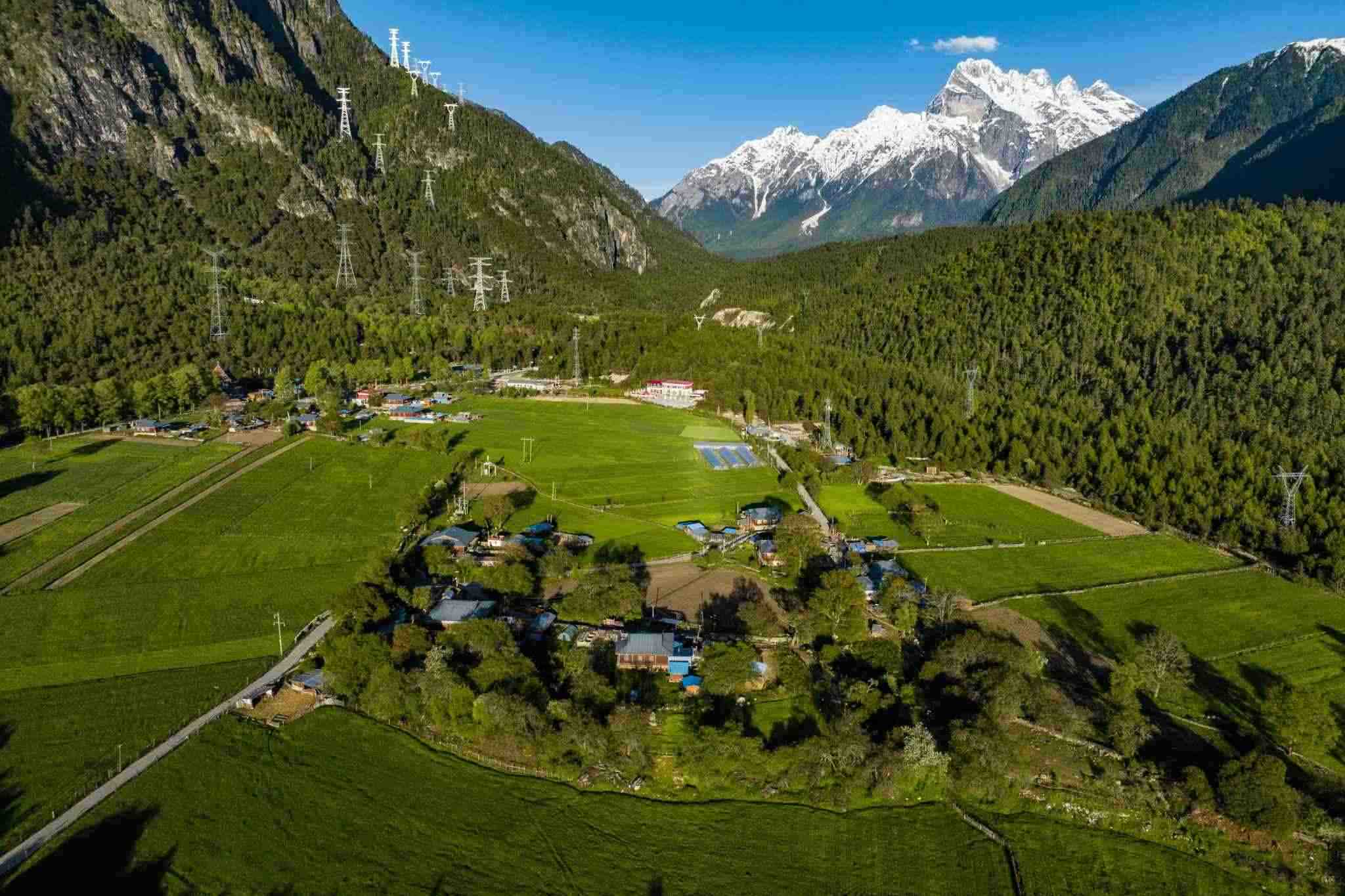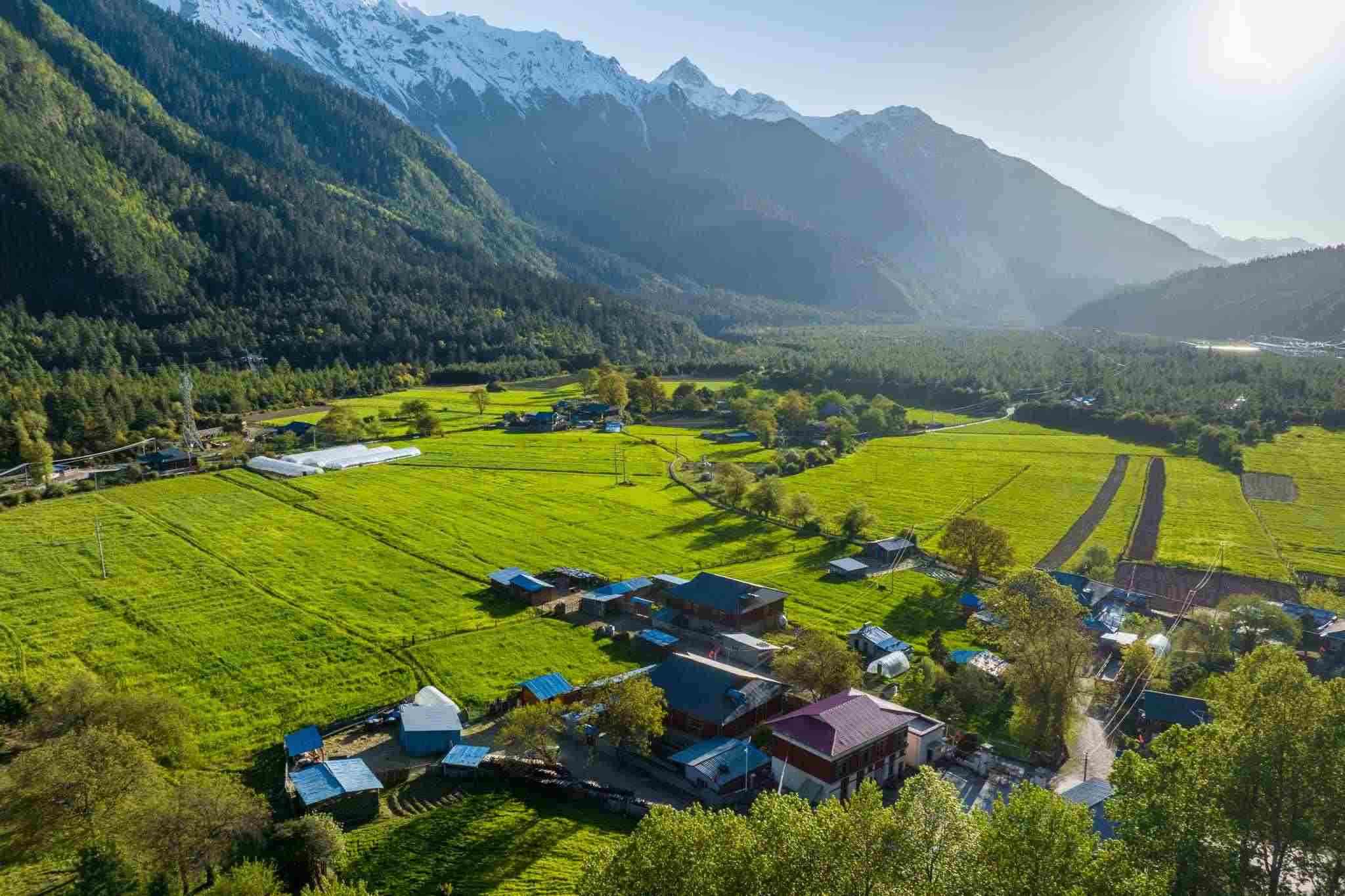 西藏林芝:村莊樹木茂密 遠(yuǎn)處雪山巍峨