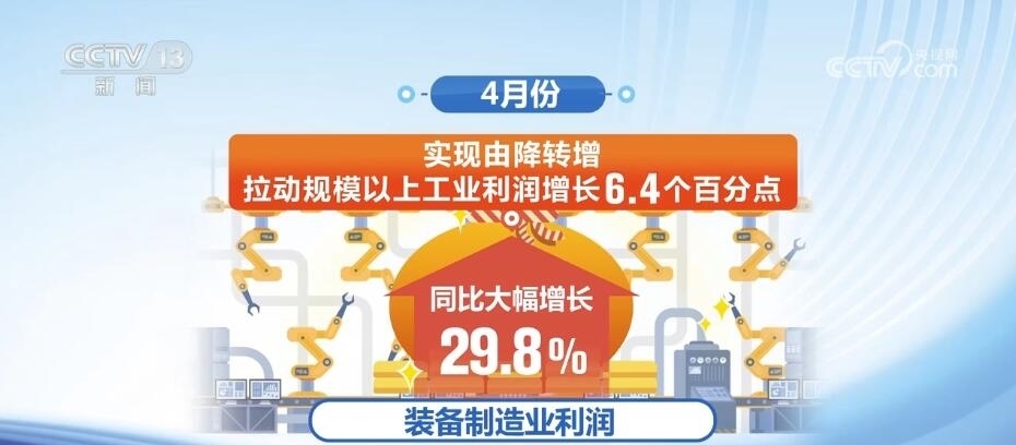 裝備制造業(yè)利潤明顯恢復。4月份,裝備制造業(yè)利潤同比大幅增長29.8%,實現(xiàn)由降轉(zhuǎn)增,拉動規(guī)模以上工業(yè)利潤增長6.4個百分點。其中,汽車行業(yè)利潤增幅最大,較去年大幅增長20.4倍,電氣機械行業(yè)及通用設備行業(yè)利潤恢復明顯,分別增長37.5%和63.7%。