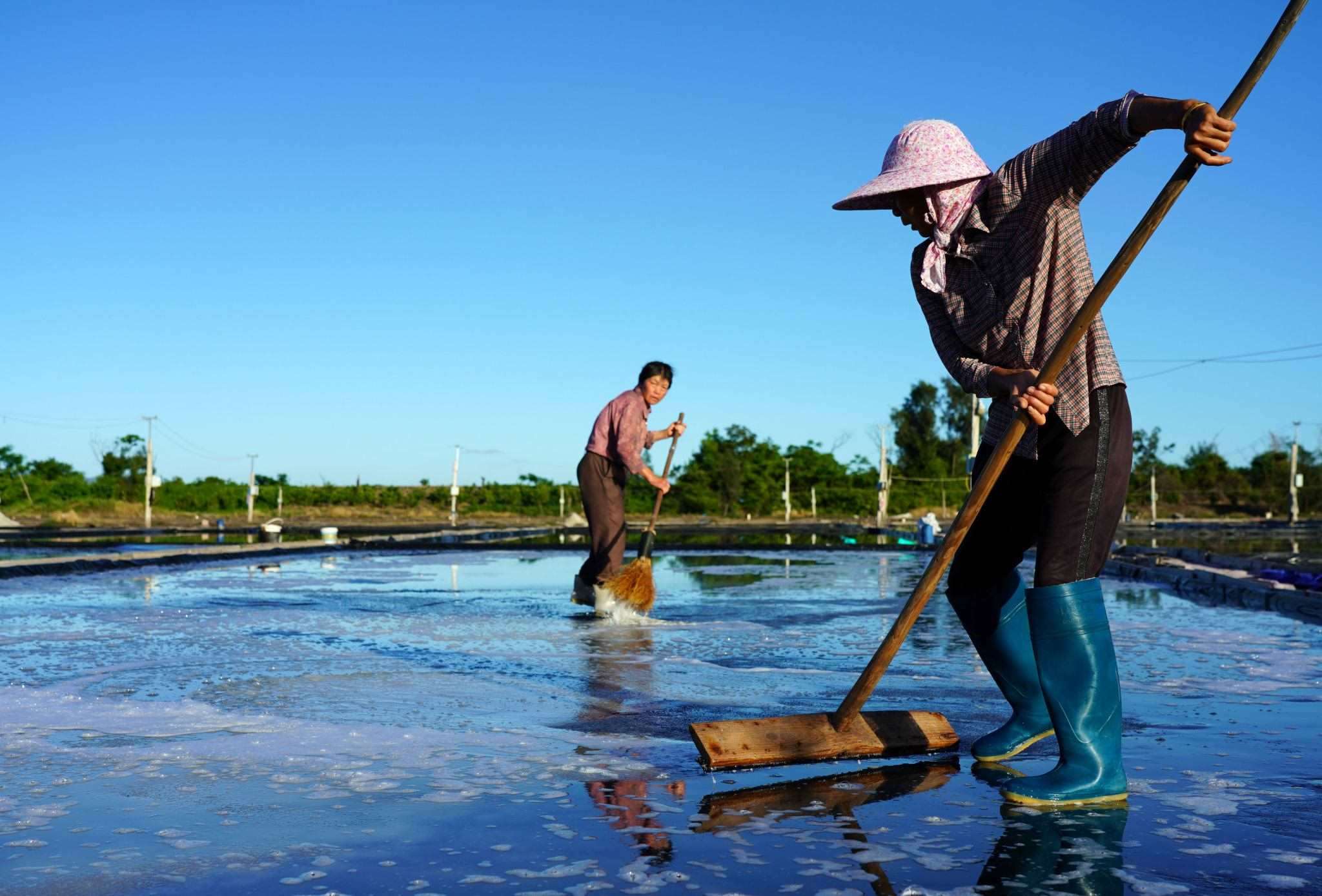 2023年5月29日,浙江溫州,在樂清市南塘鎮(zhèn)山馬曬鹽場,鹽民在鹽田里收鹽。視覺中國