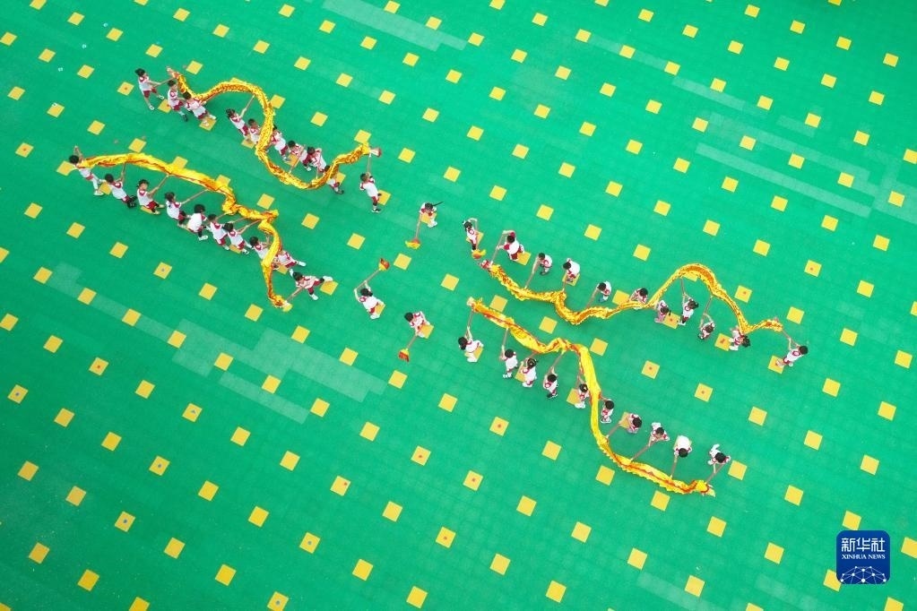 5月30日,在河北省唐山市豐潤區(qū)左家塢鎮(zhèn)中心幼兒園,孩子們?cè)诒硌菸椠埞?jié)目(無人機(jī)照片)。 新華社發(fā)(朱大勇攝)