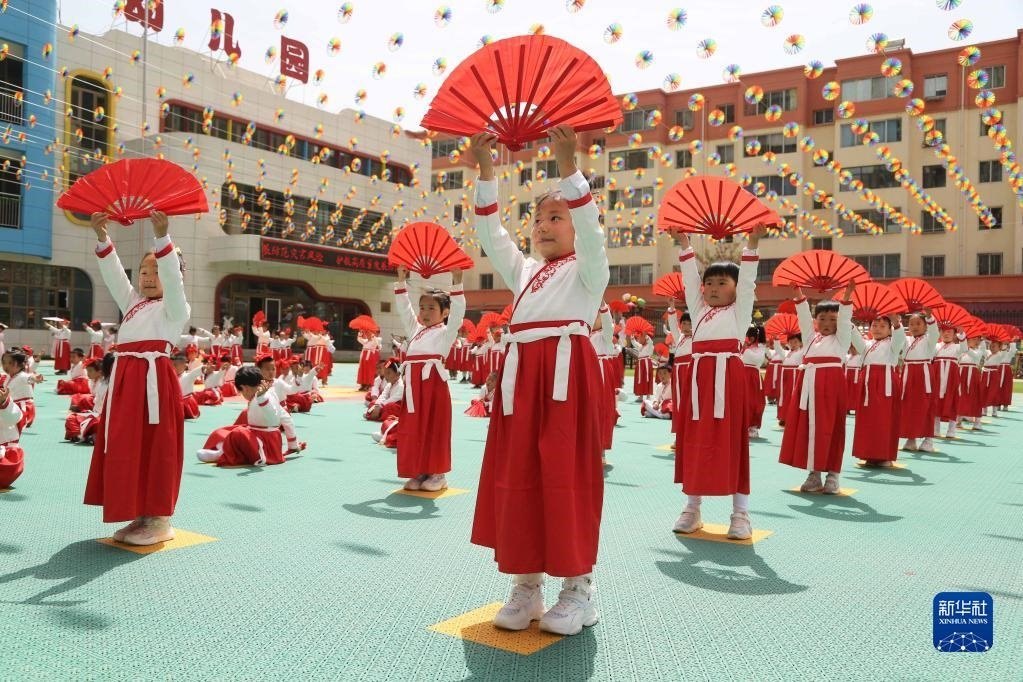 5月30日,甘肅省定西市安定區(qū)中華路幼兒園的小朋友在表演節(jié)目。 新華社發(fā)(王克賢攝)