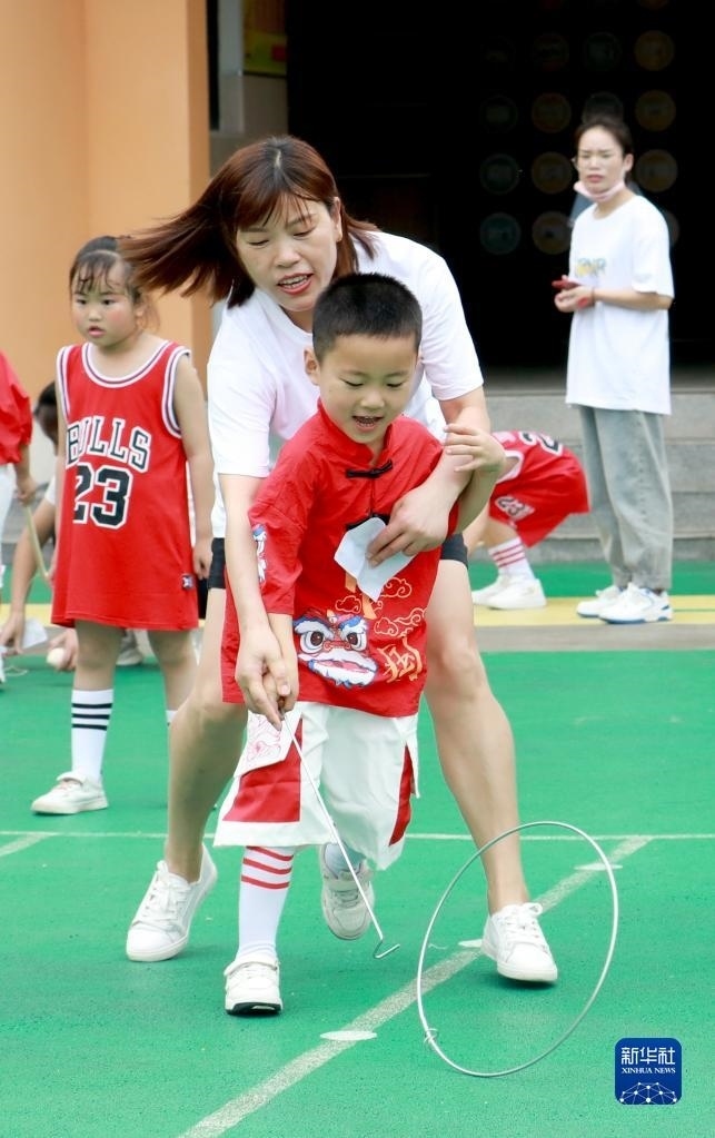 5月30日,在四川省華鎣市杜家坪幼兒園,家長和孩子在一起參加滾鐵環(huán)游戲。 新華社發(fā)(周松林?jǐn)z)