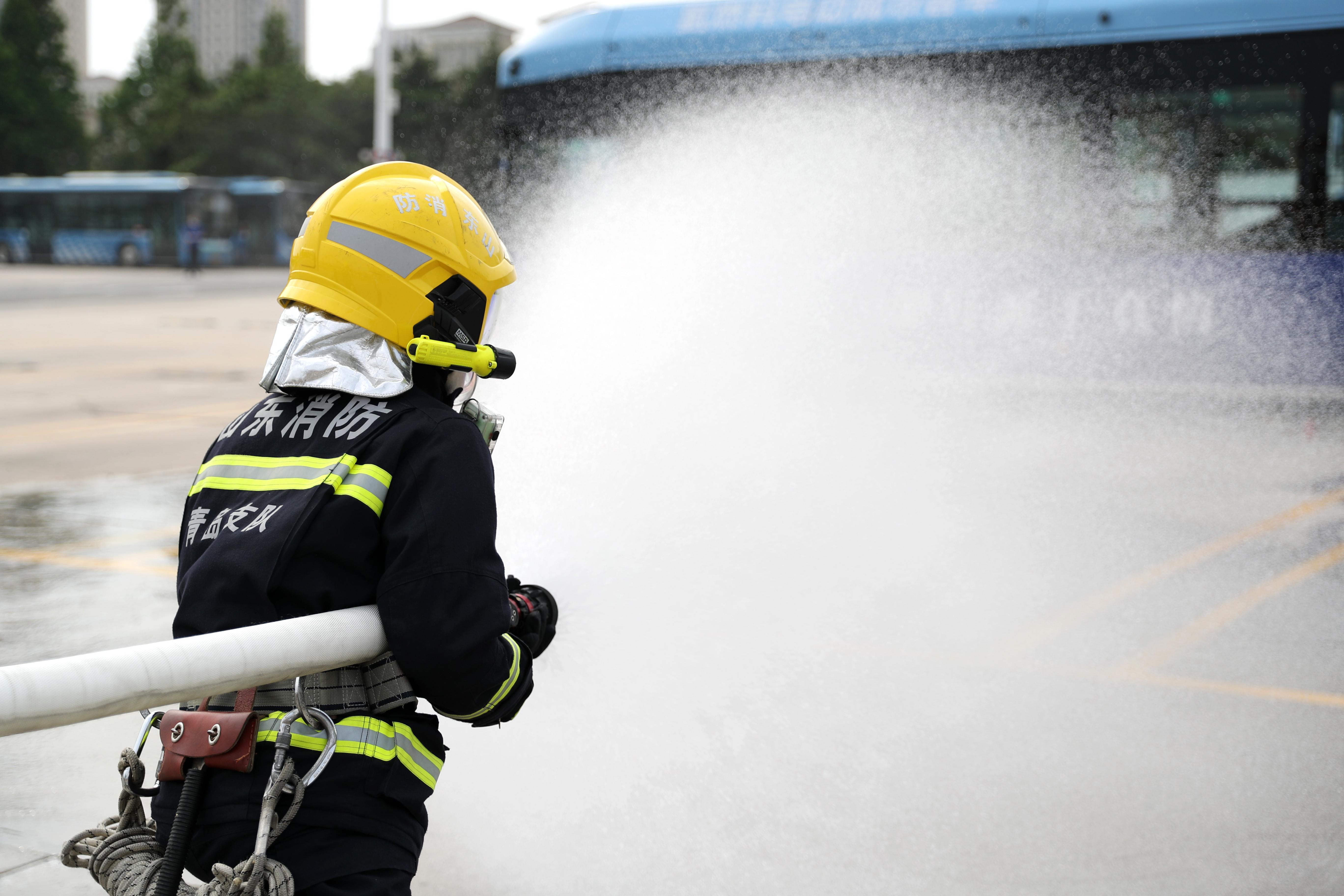 5月30日,山東青島,消防官兵在進(jìn)行公交車氫氣管路受損泄漏應(yīng)急處置演練。