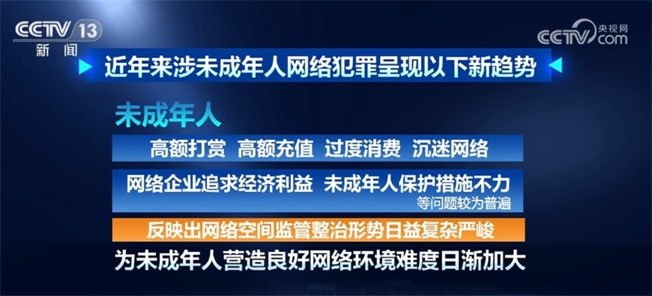 據(jù)最高檢相關(guān)部門負(fù)責(zé)人介紹,近年來(lái)涉未成年人網(wǎng)絡(luò)犯罪呈現(xiàn)以下新趨勢(shì):未成年人觸網(wǎng)低齡化日趨明顯,更易遭受網(wǎng)絡(luò)不法侵害;利用網(wǎng)絡(luò)侵害未成年人犯罪手段復(fù)雜多樣,方式不斷翻新,“網(wǎng)絡(luò)誘騙”“隔空猥褻”等新類型犯罪隱蔽性強(qiáng)、打擊難度大;一些未成年人通過(guò)網(wǎng)絡(luò)接觸暴力、色情、毒品、低俗等不良信息,導(dǎo)致形成不健康價(jià)值觀,甚至盲目跟風(fēng)、走向違法犯罪;未成年人高額打賞、高額充值、過(guò)度消費(fèi)、沉迷網(wǎng)絡(luò),網(wǎng)絡(luò)企業(yè)追求經(jīng)濟(jì)利益、未成年人保護(hù)措施不力等問(wèn)題較為普遍,反映出網(wǎng)絡(luò)空間監(jiān)管整治形勢(shì)日益復(fù)雜嚴(yán)峻,為未成年人營(yíng)造良好網(wǎng)絡(luò)環(huán)境難度日漸加大。