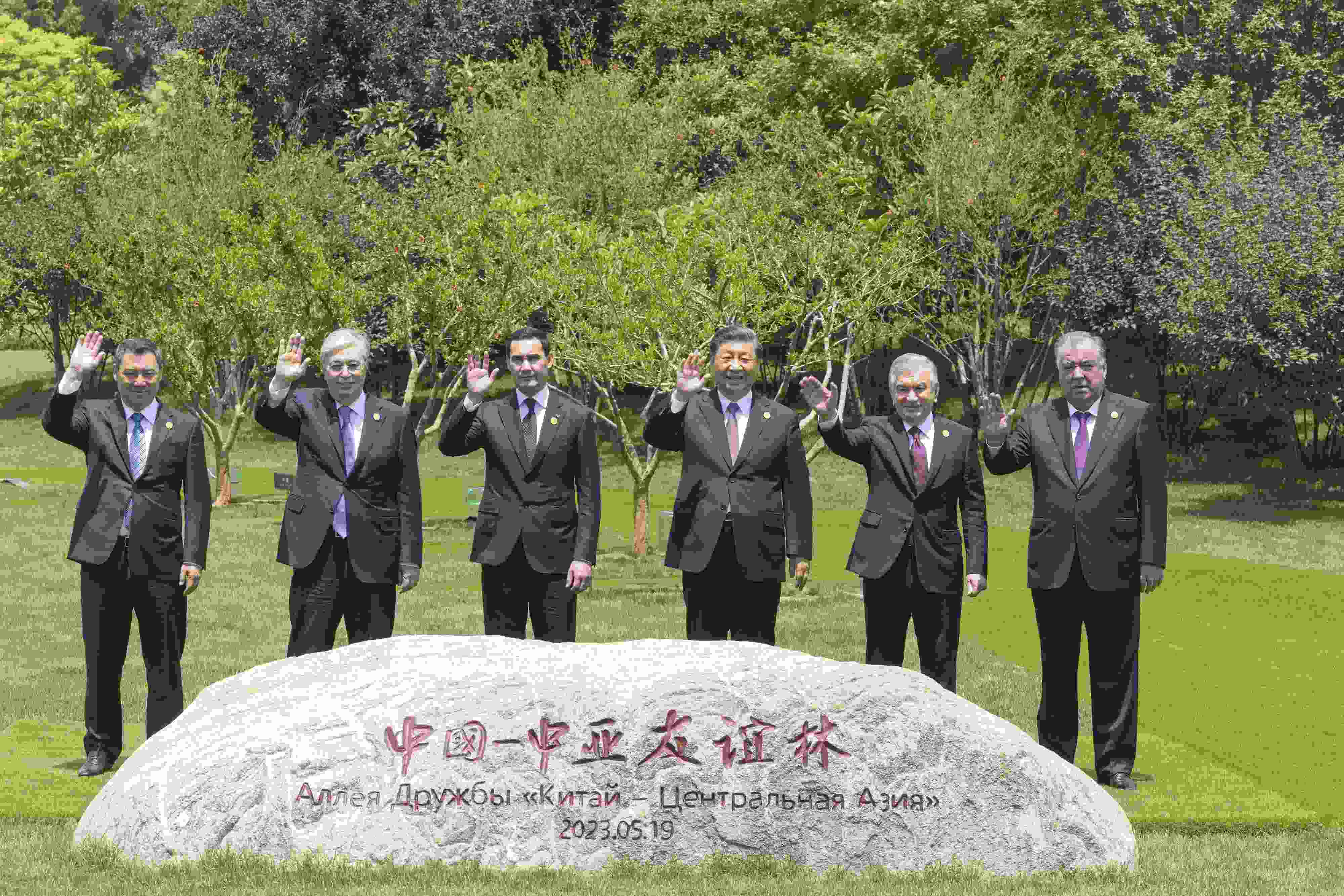 △5月19日上午,習近平主席在陜西省西安市主持首屆中國-中亞峰會并發(fā)表主旨講話。峰會結束后,習近平和中亞五國元首共同種下六棵石榴樹。