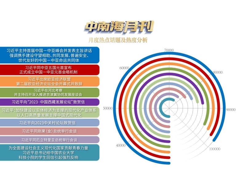 央視網(wǎng)“智聞”系統(tǒng)提取分析5月全網(wǎng)時政新聞熱點顯示,“習近平主持首屆中國—中亞峰會并發(fā)表主旨講話 強調攜手建設守望相助、共同發(fā)展、普遍安全、世代友好的中國—中亞命運共同體”“習近平同中亞五國元首宣布正式成立中國—中亞元首會晤機制”“習近平出席歐亞經(jīng)濟聯(lián)盟第二屆歐亞經(jīng)濟論壇全會開幕式并致辭”等元首外交活動備受關注。