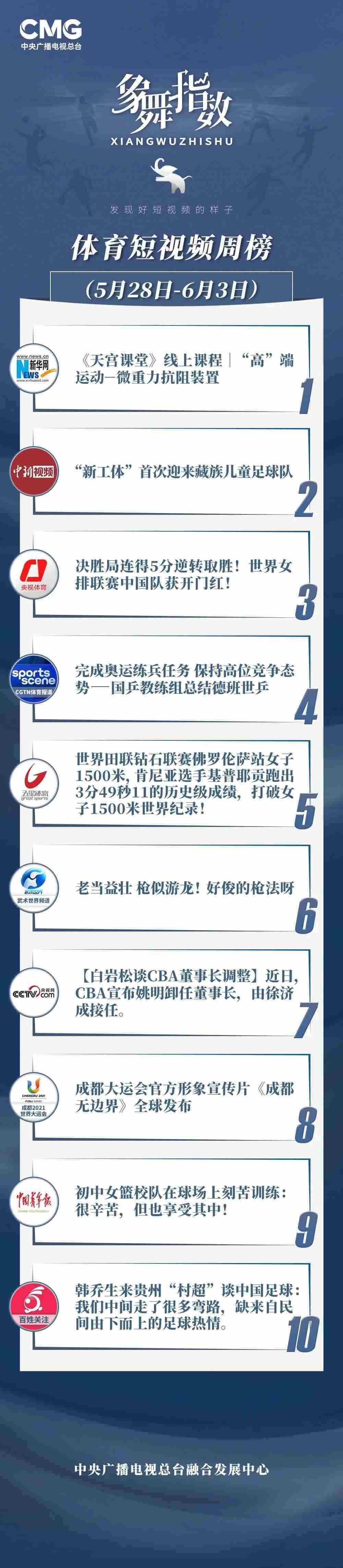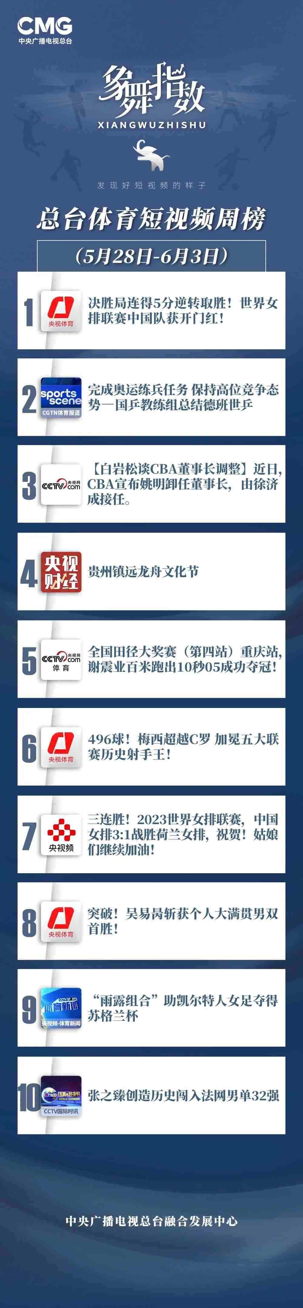 中央廣播電視總臺(tái)“象舞指數(shù)”評(píng)議品牌,推出體育短視頻周榜、總臺(tái)體育短視頻周榜。在5月28日—6月3日,以下內(nèi)容獲得矚目: