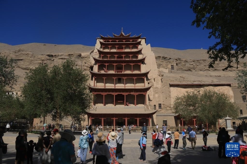 6月8日,游客在世界文化遺產地莫高窟參觀游覽。