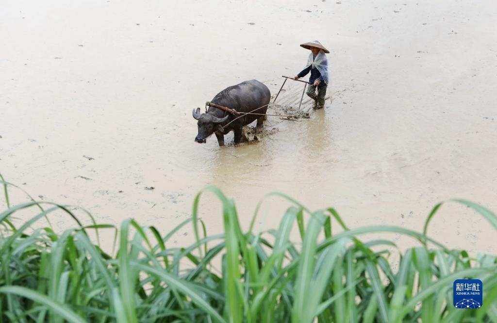6月5日,在湖南省永州市道縣營江街道芒頭寨村,農(nóng)民在平整水田。