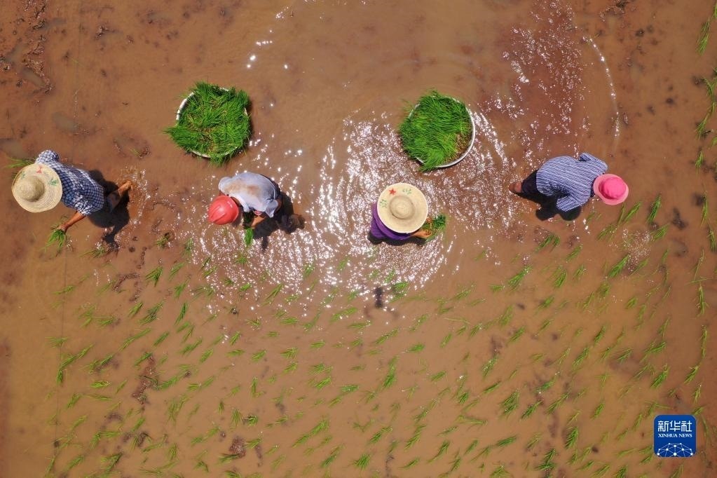 6月5日,江西省吉安市泰和縣澄江鎮(zhèn)新池村農(nóng)民在田間拋秧。
