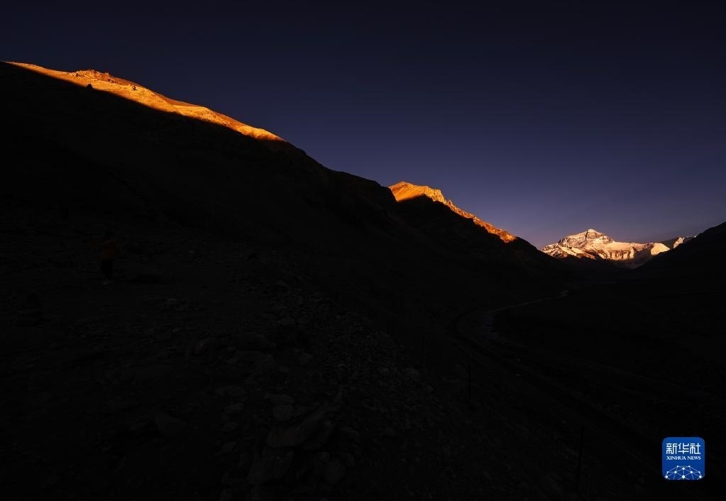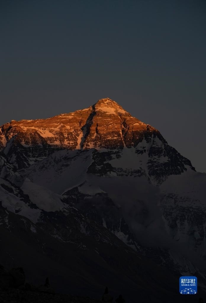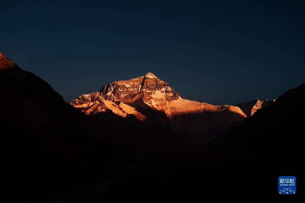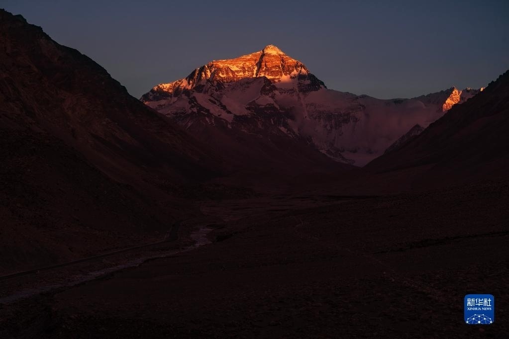 巍峨的珠穆朗瑪峰屹立于青藏高原,珠峰地區(qū)氣候復(fù)雜,景色瞬息萬變。“國道之行 從雪山奔向大?!眻?bào)道組在落日時(shí)分來到珠穆朗瑪峰腳下,記錄下世界之巔的“日照金山”壯美場景。   新華社記者 費(fèi)茂華 攝
