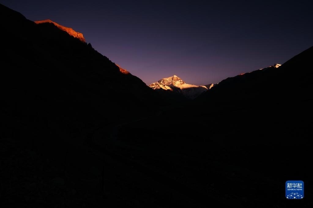6月4日拍攝的太陽完全落山之后的珠峰。   新華社記者 費(fèi)茂華 攝