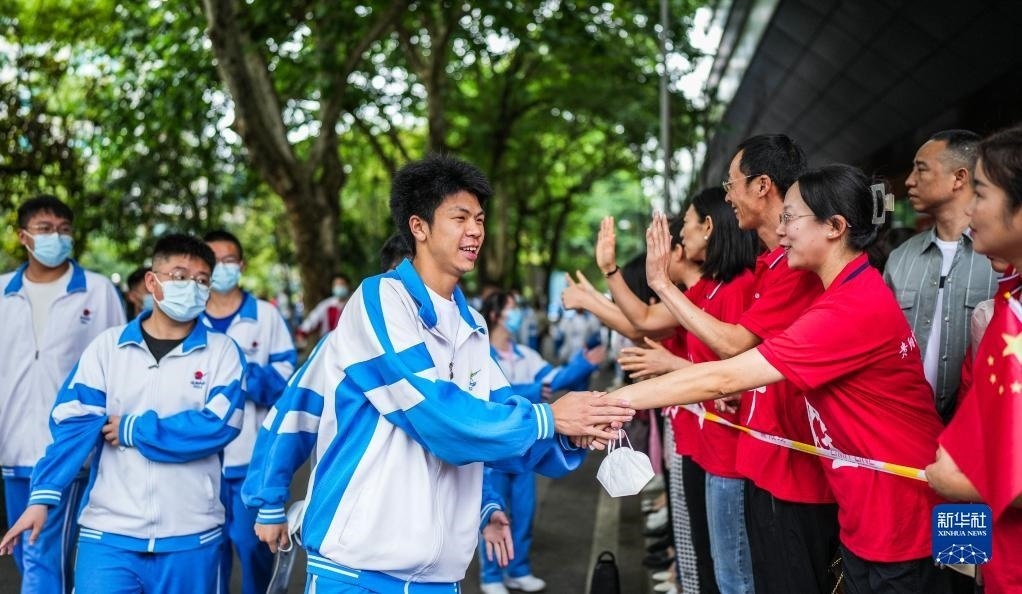 6月7日,在吉林省長(zhǎng)春市五十六中學(xué)考點(diǎn),考生入場(chǎng)前與送考老師擊掌。   新華社記者 顏麟蘊(yùn) 攝
