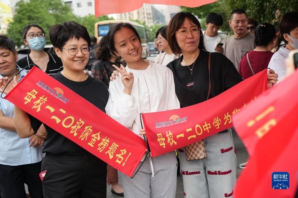 6月7日,考生在遼寧省實(shí)驗(yàn)中學(xué)考點(diǎn)外與老師合影留念。   新華社記者 潘昱龍 攝