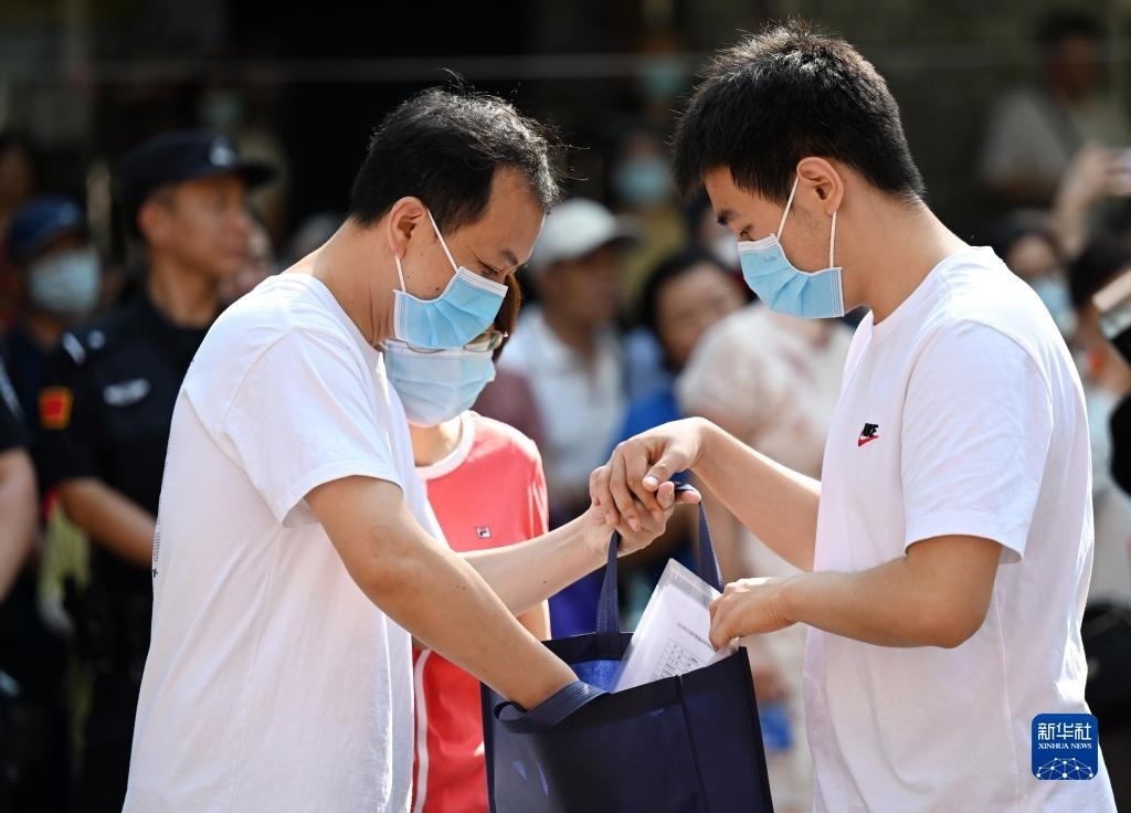 6月7日,在北京師范大學(xué)附屬實(shí)驗(yàn)中學(xué)考點(diǎn)門口,考生家長(zhǎng)給考生加油打氣。   新華社記者 李鑫 攝